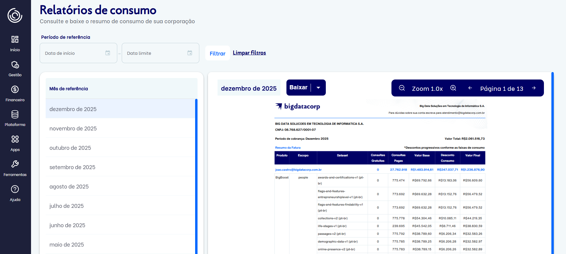 Os Relatórios de Consumo permitem visualizar e baixar o detalhamento mensal da utilização dos produtos da BigDataCorp. Para acessar essa funcionalidade, navegue até Financeiro → Relatórios de Consumo, onde os relatórios são exibidos do mais recente ao mais antigo.