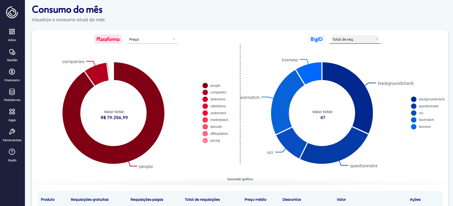 Abaixo do gráfico, a tabela de consumo por produto reúne as informações do mês corrente, incluindo produto, quantidade de requisições gratuitas e pagas, total de requisições, preço médio, descontos aplicados e valor total consumido. A partir da coluna Ações, é possível acessar informações mais detalhadas sobre o consumo de cada produto.