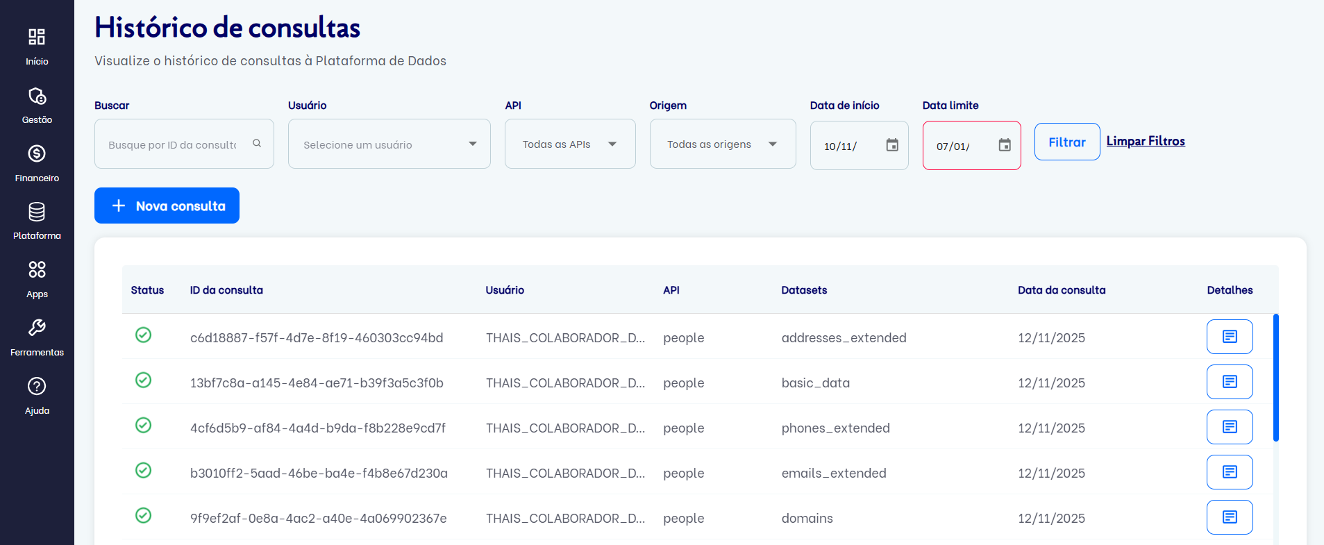 Abaixo dos filtros, a tabela de histórico apresenta uma linha para cada consulta realizada, exibindo informações como status, ID da consulta (QueryID), usuário responsável, API utilizada, datasets consultados e data da execução.