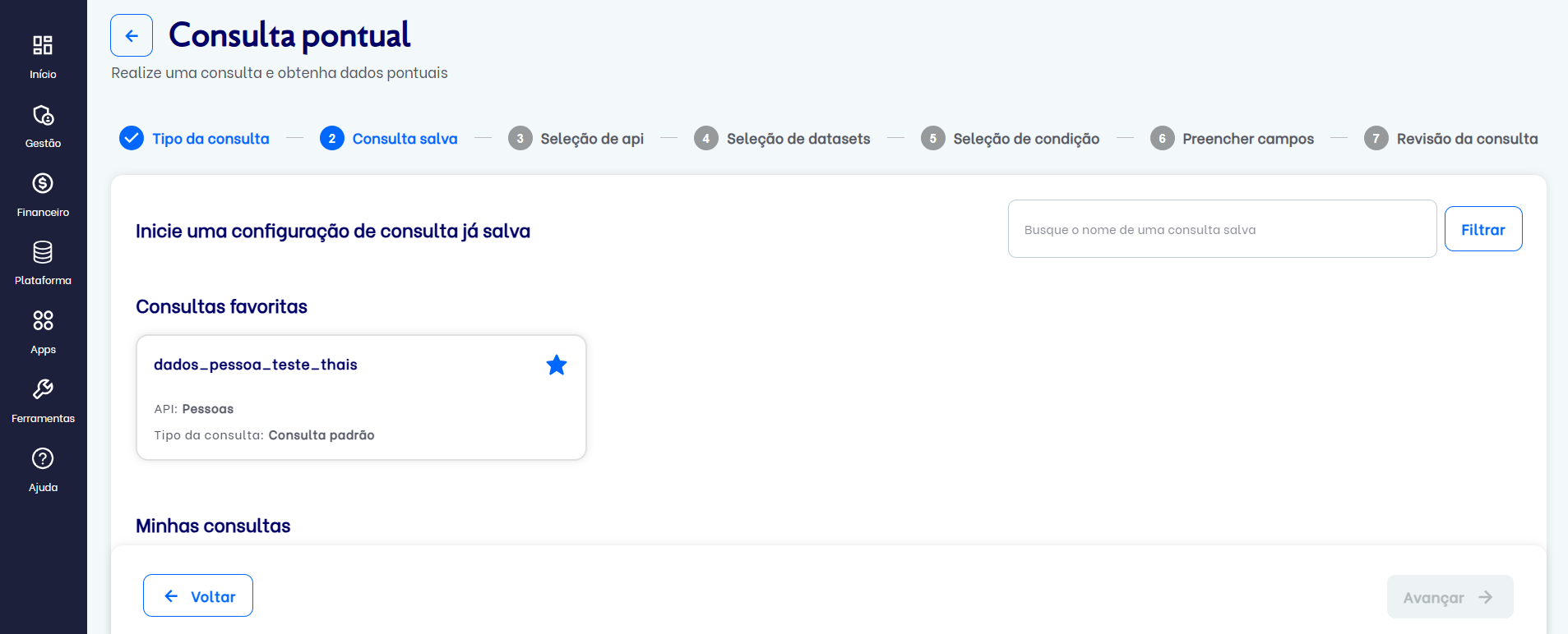 A funcionalidade de Consulta Pontual permite reutilizar configurações salvas anteriormente, agilizando o processo de consulta sem a necessidade de refazer toda a configuração. Para acessá-la, navegue até Plataforma → Consulta Pontual.